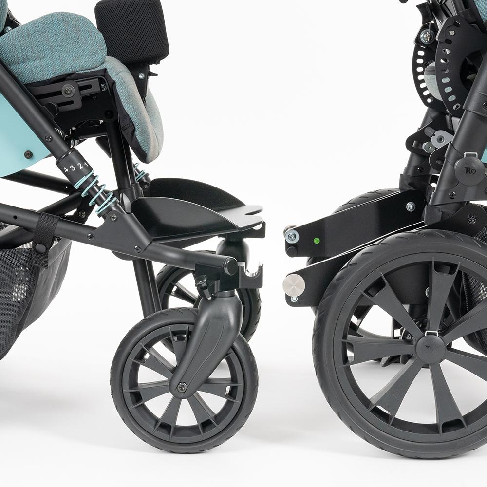 La solución de diseño especial BINGO Evolution Twins es adecuada para gemelos o hermanos que requieren una posición individual. Incluso con una longitud total de aproximadamente 1,60 metros, el cochecito gemelar es fácil de conducir y sigue siendo compacto y maniobrable como de costumbre. Gracias al innovador sistema de acoplamiento, los dos cochecitos de rehabilitación también pueden utilizarse por separado si es necesario. No se necesitan herramientas para acoplarlos o desacoplarlos.