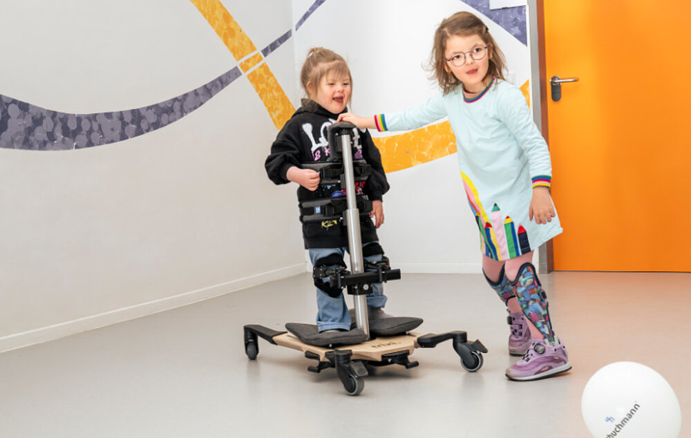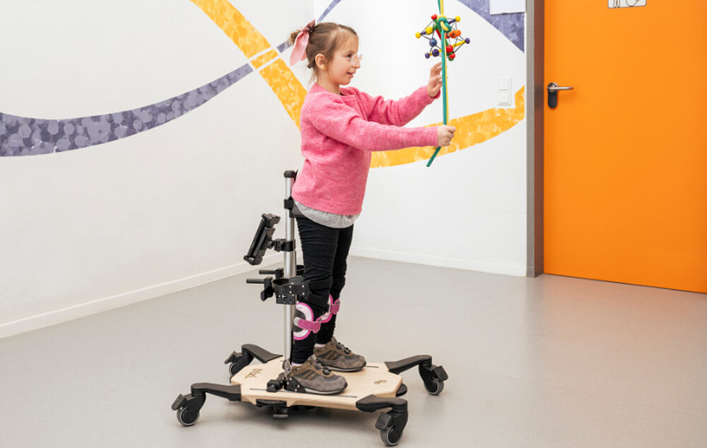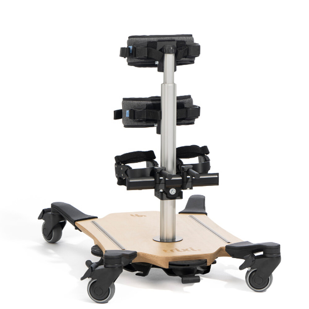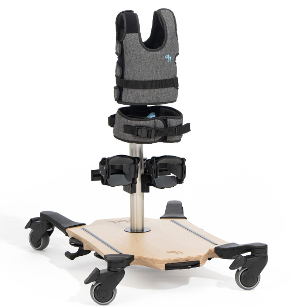 La aplicación stixi. App proporciona más diversión y motivación al ponerse de pie mediante el registro de los tiempos de bipedestación y la visualización del progreso en una curva de éxito. El modelo básico está disponible en versión dinámica o rígida según las necesidades y puede equiparse con un chaleco y soportes pélvicos y torácicos para un apoyo adicional. Los soportes de rodilla ajustables tridimensionalmente proporcionan una amplia superficie de apoyo que reduce la presión en cualquier posición y, junto con el soporte pélvico, garantizan una sensación de seguridad. Las ruedas con bloqueo total permiten entrar y salir con seguridad, ya que evitan que ruede involuntariamente. Una mesa terapéutica abre un amplio abanico de usos terapéuticos y lúdicos, mientras que los bordes de los talones proporcionan un apoyo adicional por detrás.