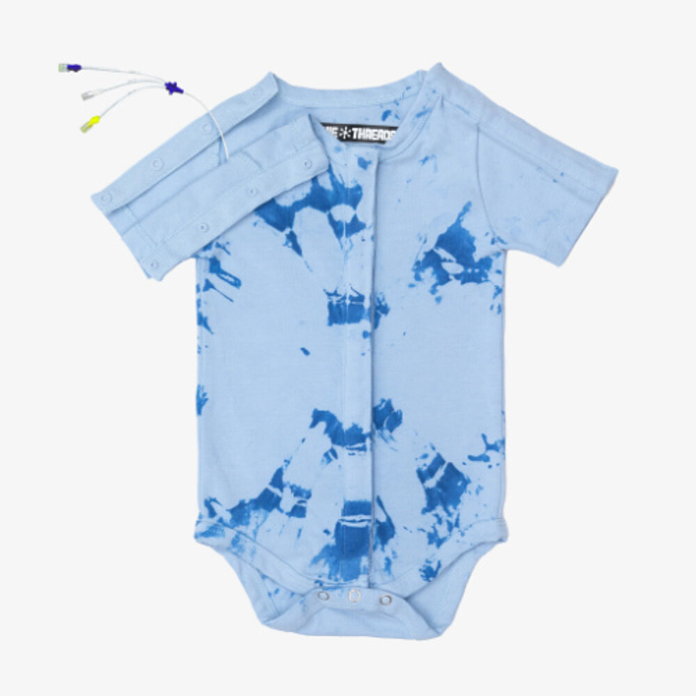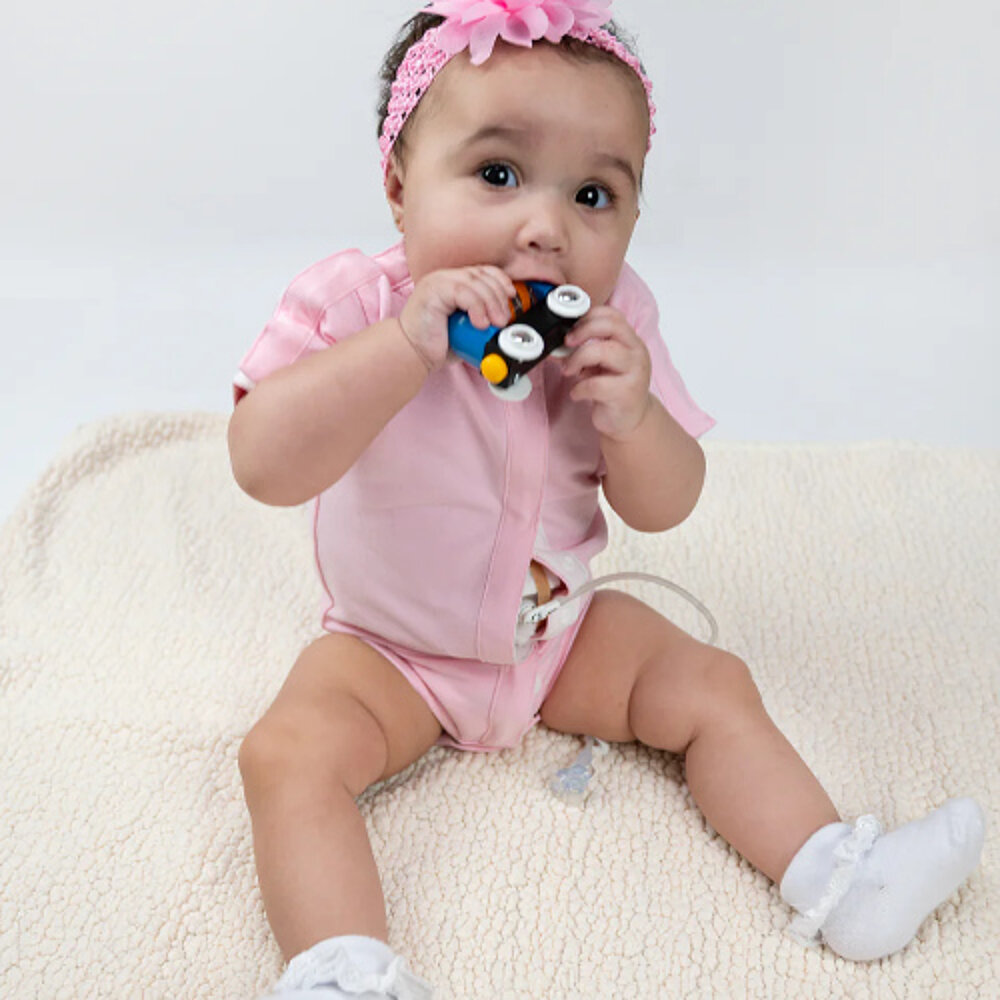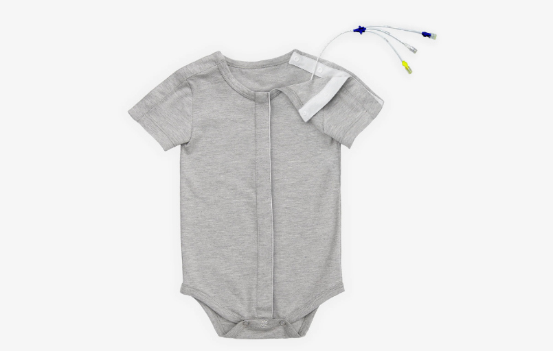 Este body adaptable tiene botones de presión en las costuras de los hombros y en la parte delantera para permitir el acceso a las sondas de alimentación, catéteres o conectores sin tener que quitarse la prenda.