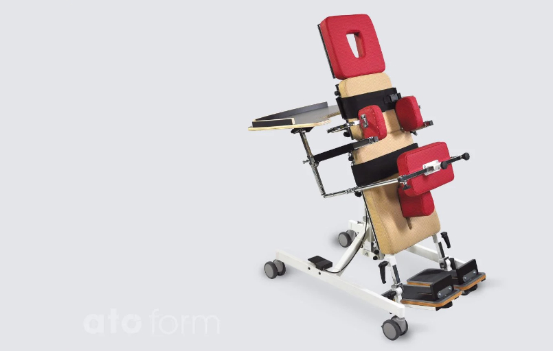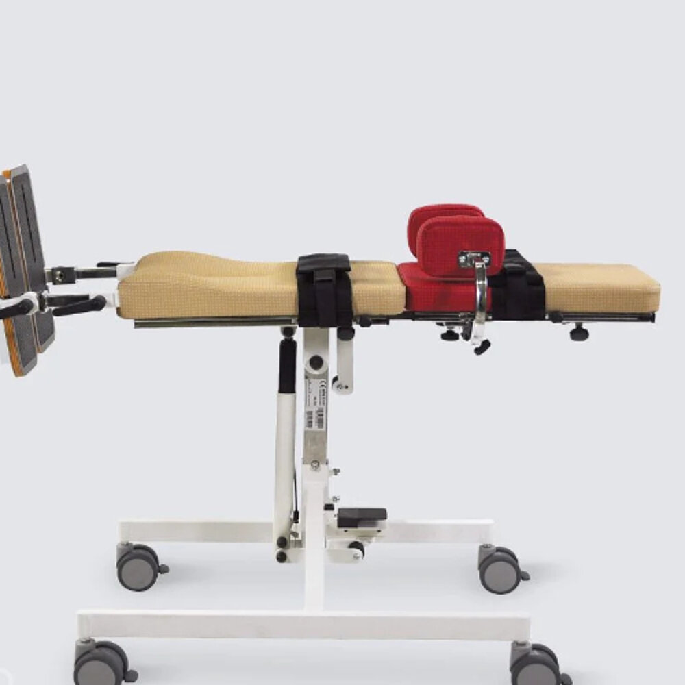 El tablero prono-reclinable BS permite al usuario sentarse erguido hasta una posición de pie.
