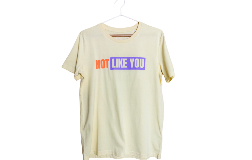 - Camiseta unisex en fresco amarillo pastel con estampado en morado y naranja neón