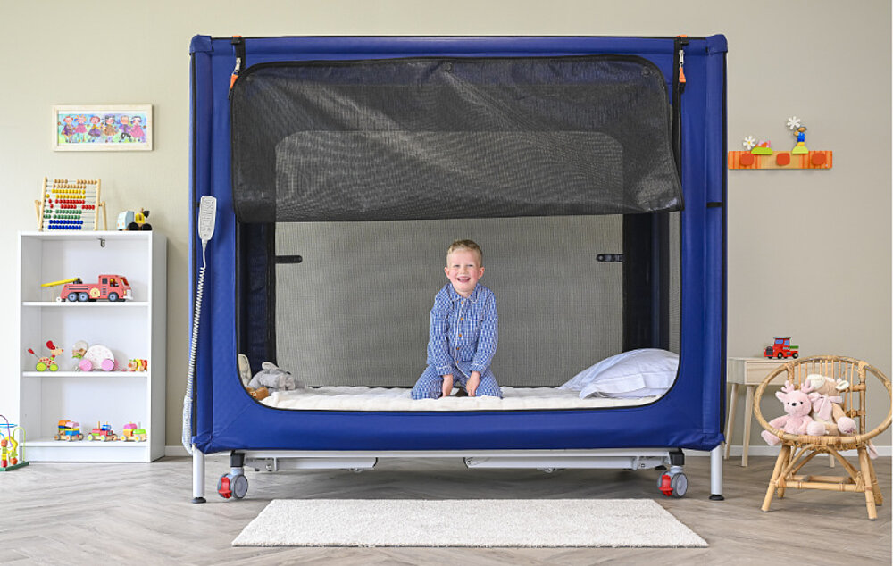 Gracias a su gran superficie de reposo (200 × 90 cm), su somier de altura regulable, sus redes de seguridad reforzadas, su acceso bajo y su apertura por ambos lados, COCOON ofrece unas condiciones óptimas para el cuidado, la terapia y la vida cotidiana. Su diseño compacto cabe por puertas estándar, es fácil de limpiar, impermeable (IPX6) y se puede colorear individualmente: para más seguridad, participación y calidad de vida en el día a día familiar.