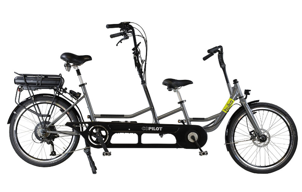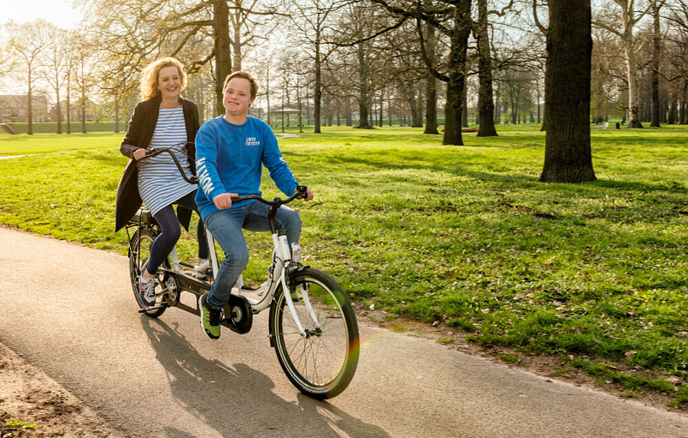Gracias a la tercera rueda, ambos ciclistas pueden sentarse cómodamente, incluso en parado. Subirse y bajarse es fácil gracias al alto nivel de estabilidad. La sección delantera puede abatirse para disponer de más espacio al subir y bajar. El acompañante se encarga de la dirección, mientras que el pasajero dispone de un manillar al que agarrarse. El acompañante decide sobre la rueda libre conectable, que permite al pasajero pedalear. La rueda libre normal permite al pasajero elegir si pedalea o no. Un tándem que permite pedalear juntos sin preocuparse por la seguridad.