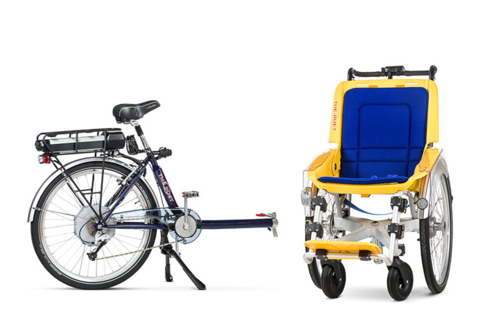 La Rollfiets Duet es una inteligente combinación de bicicleta y silla de ruedas. Mientras una persona conduce, la otra puede sentarse cómodamente en la silla de ruedas de la parte delantera. Al llegar a su destino, puede quitar la silla de ruedas y se convierte en una silla de ruedas independiente y fácil de usar.