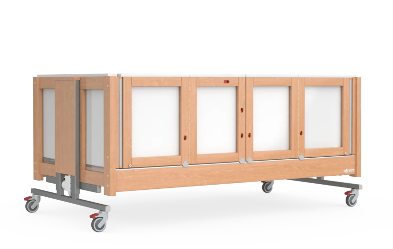 La protección integral de 60 cm con acolchado de 6 cm de grosor permanentemente integrado ofrece una protección fiable contra los movimientos involuntarios sin restringir las dimensiones internas. El somier de cuatro secciones, las puertas laterales de apertura total y el ajuste de altura de hasta 50 cm permiten un posicionamiento óptimo y facilitan los cuidados diarios, siempre con el objetivo de combinar seguridad y calidad de vida de la mejor manera posible.
