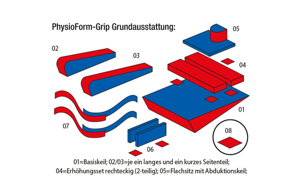 El equipo básico PhysioForm-Grip ofrece todas las piezas necesarias para la posición abdominal, lateral, de espalda y sentada de los niños más pequeños. En caso necesario, pueden añadirse piezas adicionales de la gama de accesorios. Las ilustraciones asociadas facilitan la comprensión de los posibles usos y aplicaciones.