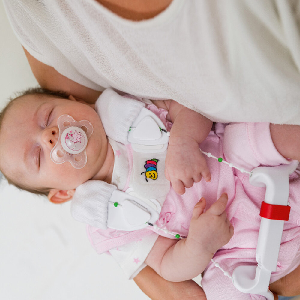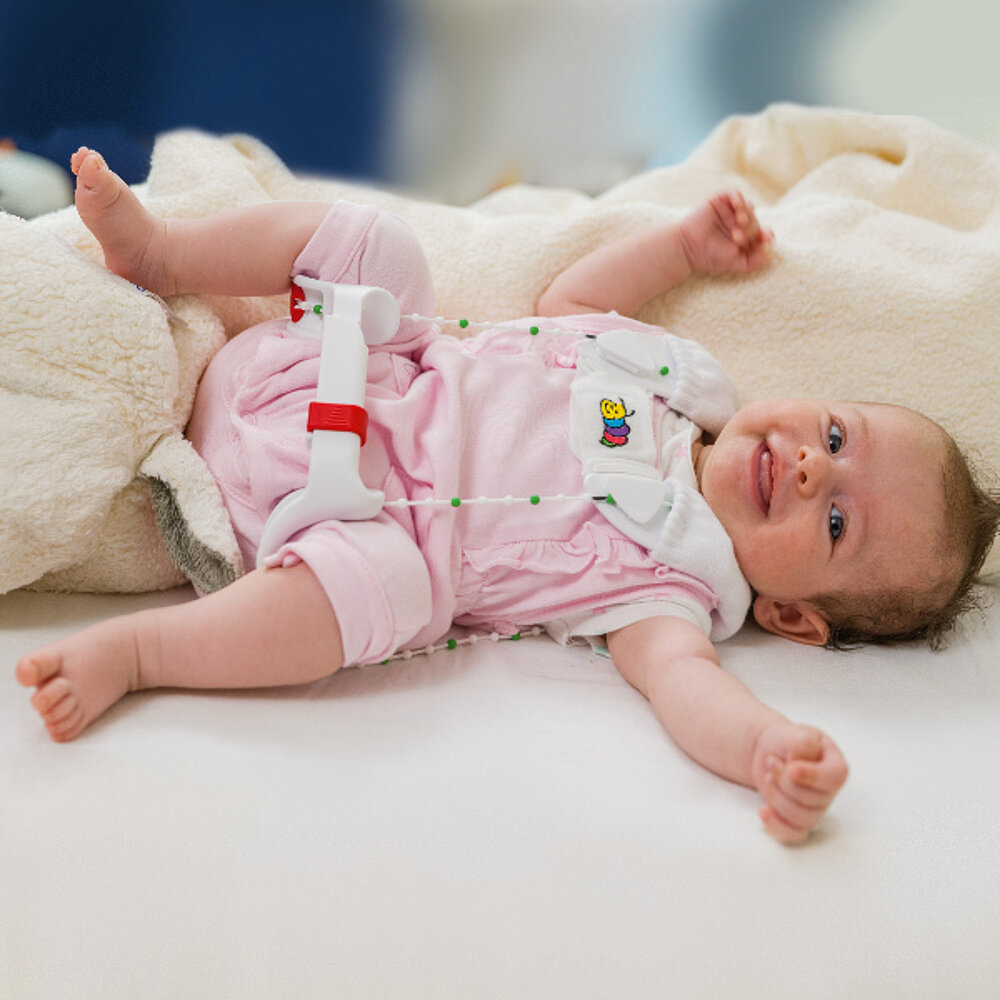 La férula hace que las articulaciones de la cadera del bebé se doblen en un ángulo de más de 90° y se separen ligeramente. Aunque esto pueda parecer inusual al principio, no es más que una prolongación de la fase prenatal. Esto permite que las caderas del bebé maduren en las mismas condiciones favorables que en el útero.