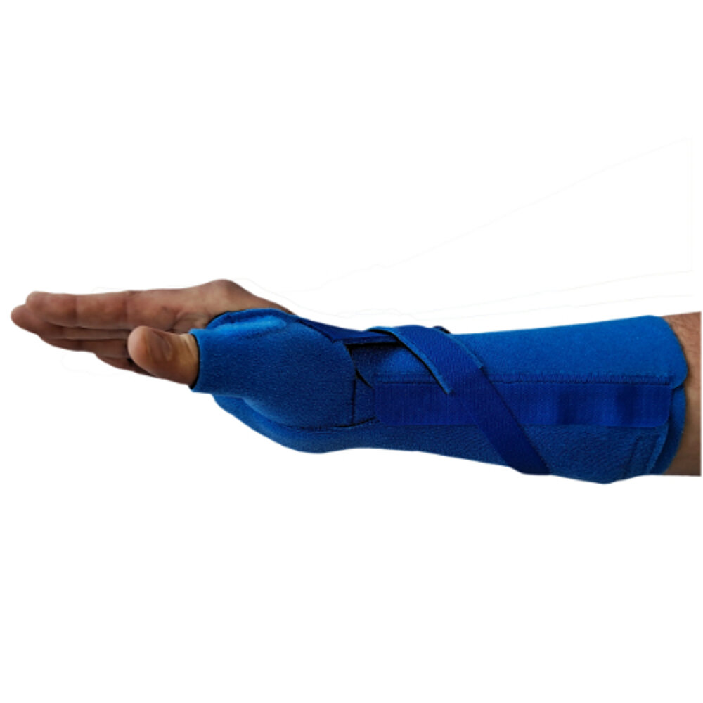- Varilla de plástico de baja temperatura moldeable y extraíble que cruza la muñeca por el lado de la palma y soporta la extensión de la muñeca