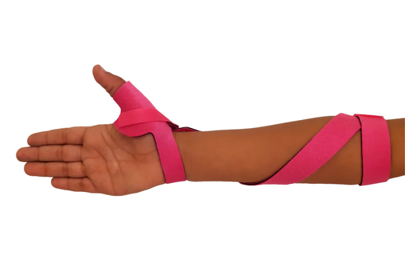 - Se sujeta al dorso de la mano por el lado del pulgar. La correa también soporta la extensión de la muñeca y la desviación radial.