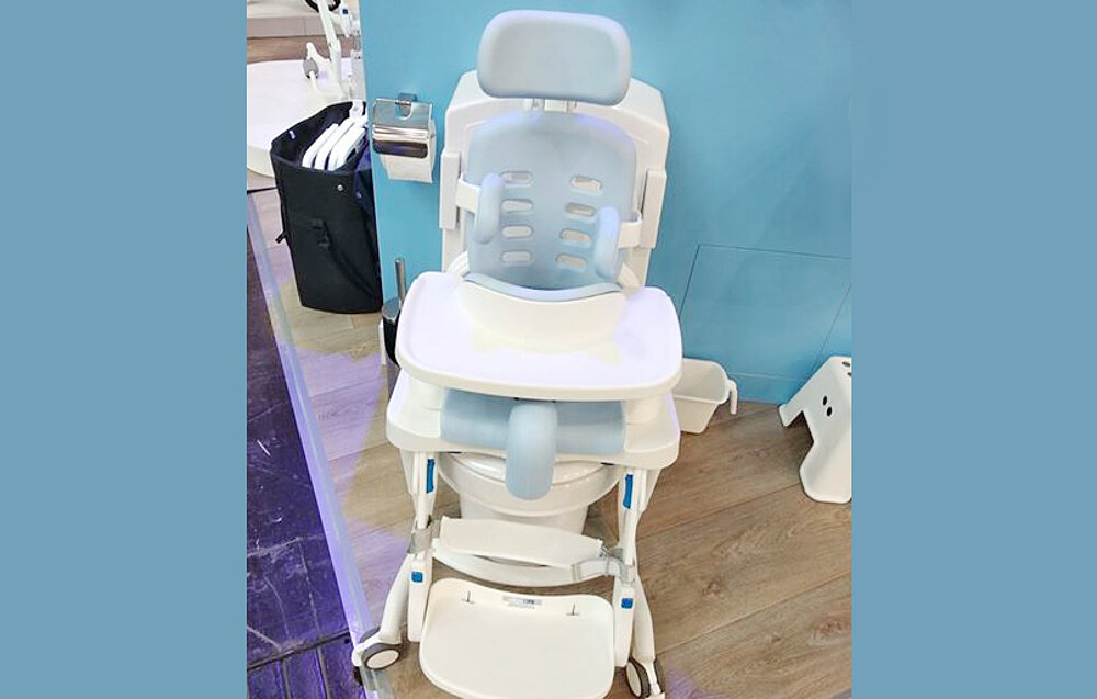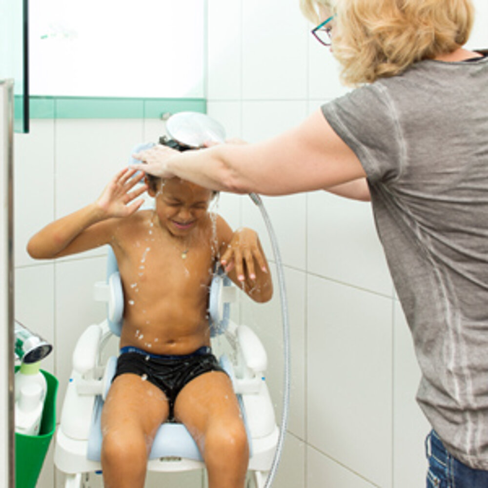 Gerade für Kinder mit wenig Körperkontrolle: als Duschstuhl hat er alles, was an Stütze gebraucht wird.