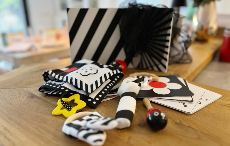 El juego de juguetes sensoriales contiene: 20 tarjetas de contraste de doble cara, un gran libro de contraste para bebés, dos lazos de cinta de madera, un libro de tela arrugada, un panda chirriante, una pluma, un pañuelo negro, un martillo de arena, un huevo de arena y una bolsa de almacenamiento. El juguete fomenta el desarrollo físico y mental, especialmente con el alto contraste de blanco y negro, que favorece los estímulos visuales saludables.