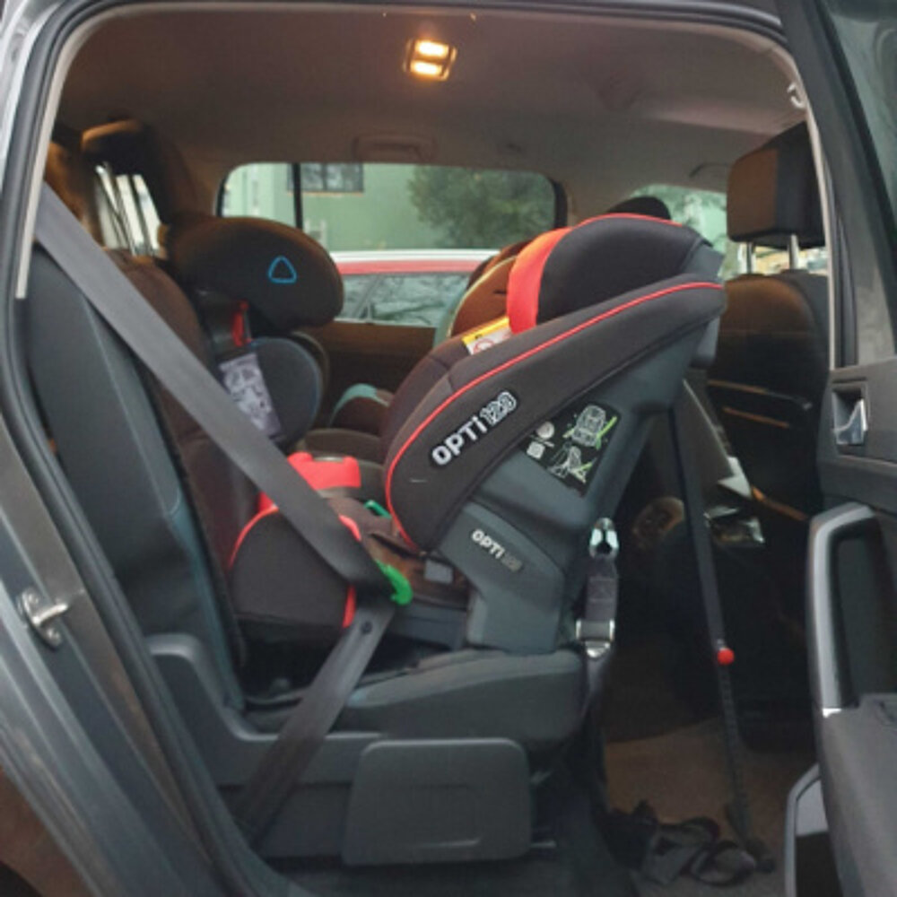 - se instala con el cinturón de 3 puntos del vehículo y también dispone de una pata de apoyo y correas tensoras