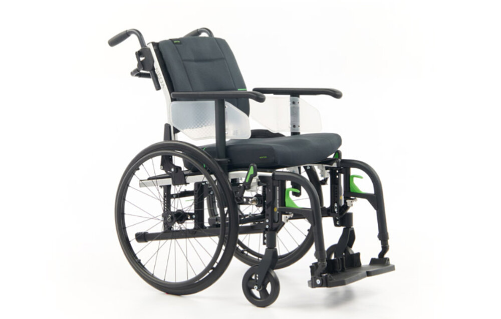 Una silla de ruedas adaptable multiajustable con un sistema de asiento y respaldo ergonómicos integrados, personalizables y probados terapéuticamente.