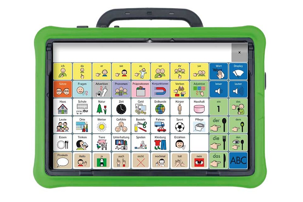 - disponible con o sin símbolos (símbolos METACOM opcionales, colección de símbolos SymbolStix y símbolos PCS)incl. síntesis de voz Acapela (una voz masculina y otra femenina, así como las voces infantiles Lea y Jonas como accesorios especiales)