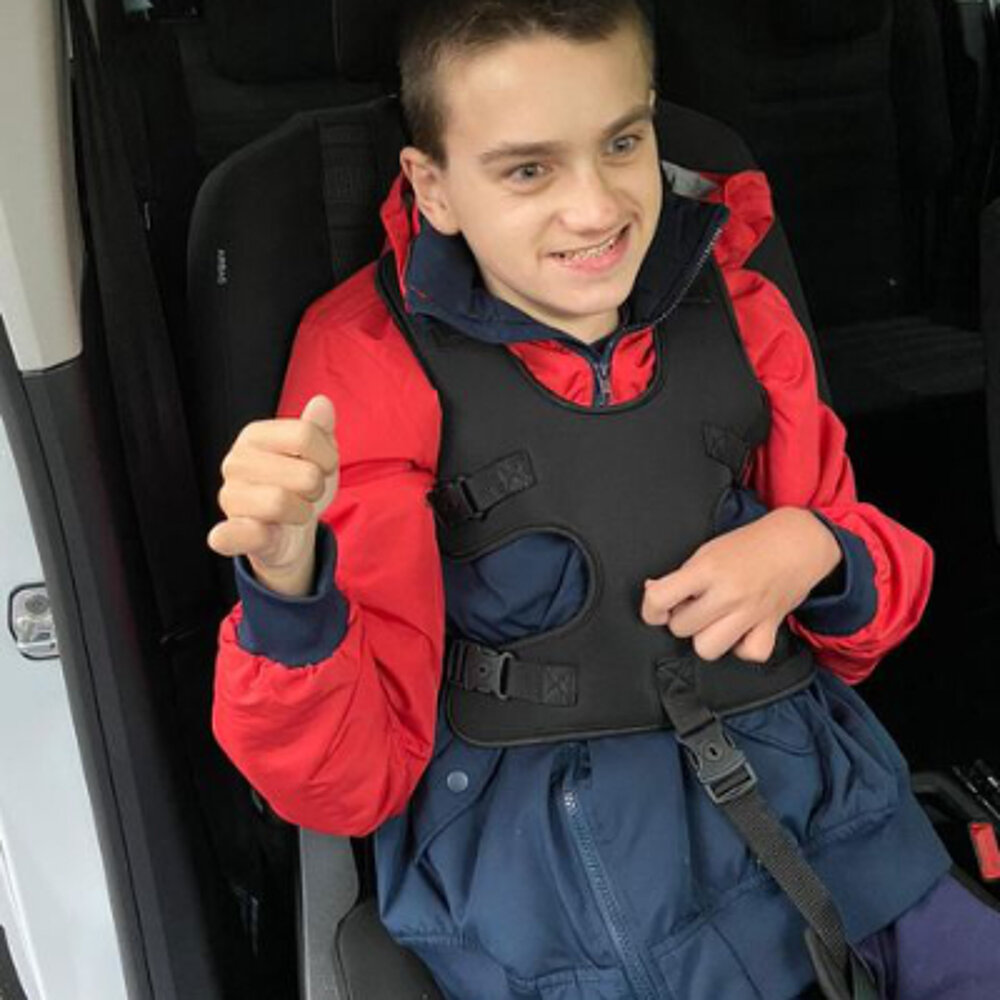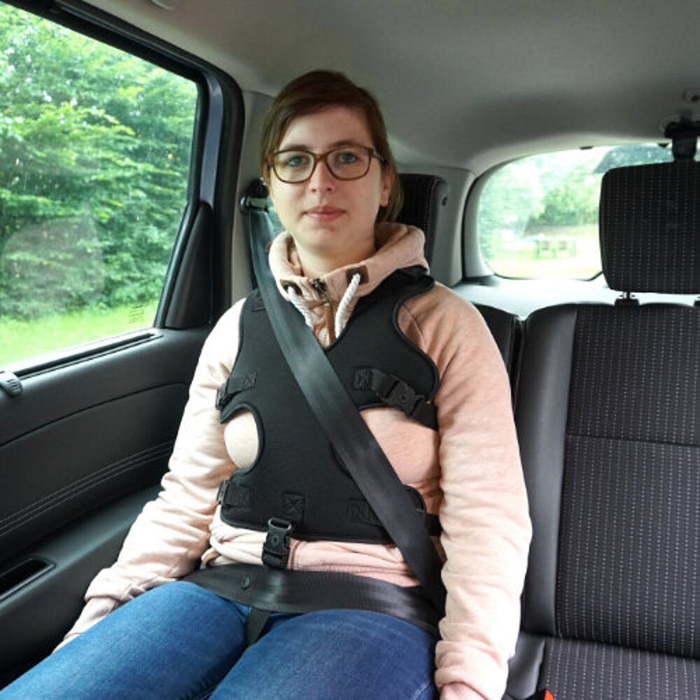 - El sistema de arnés con chaleco de asiento proporciona un soporte seguro para los hombros, la parte superior del cuerpo y la pelvis