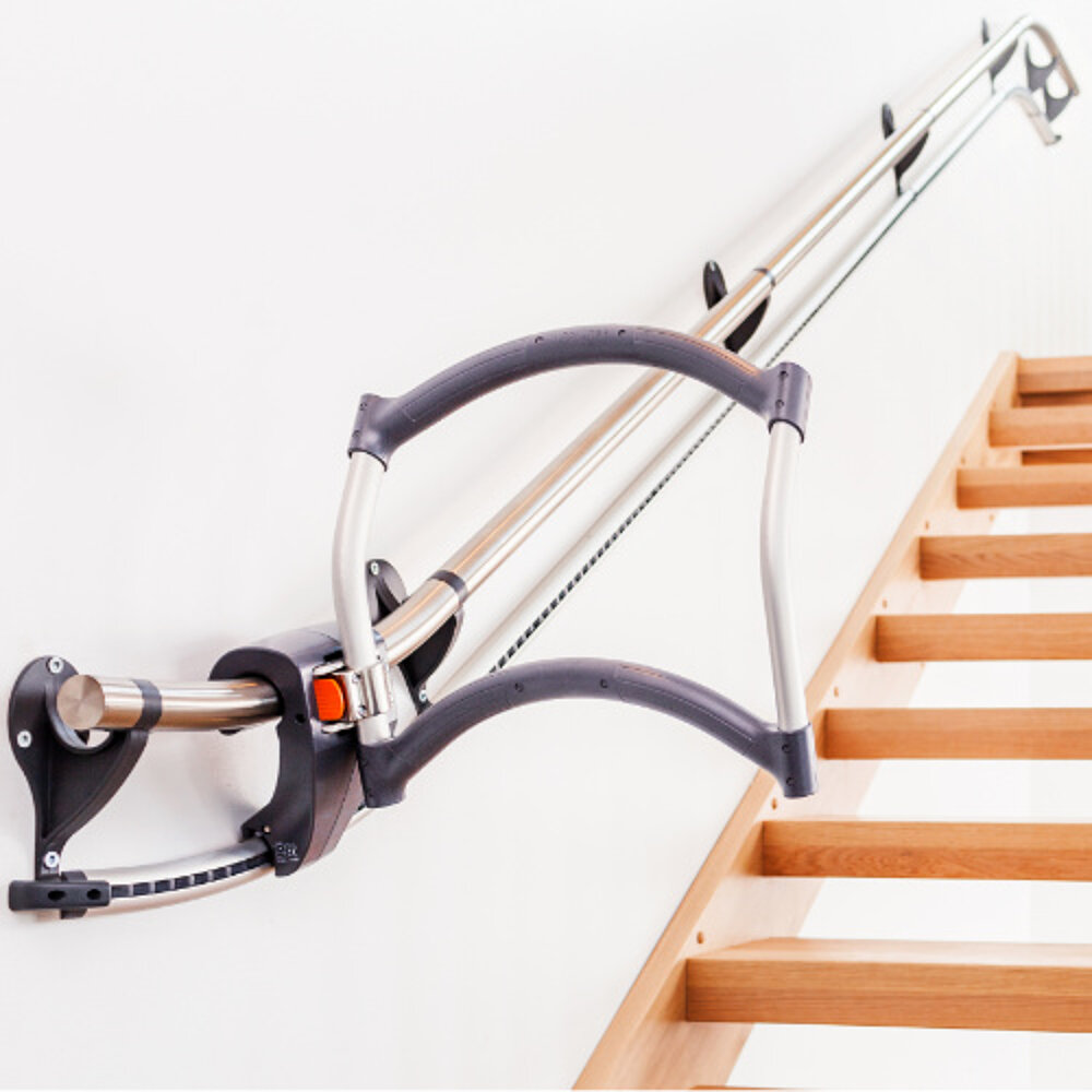 - Ahorra espacio y es discreta: distancia entre la barandilla y la pared: 9,6 cm, anchura con el asa plegada: 18,4 cm (20,4 cm con la placa posterior), anchura con el asa plegada: 55,2 cm (57,2 cm con la placa posterior), diámetro de la barandilla: 4,2 cm