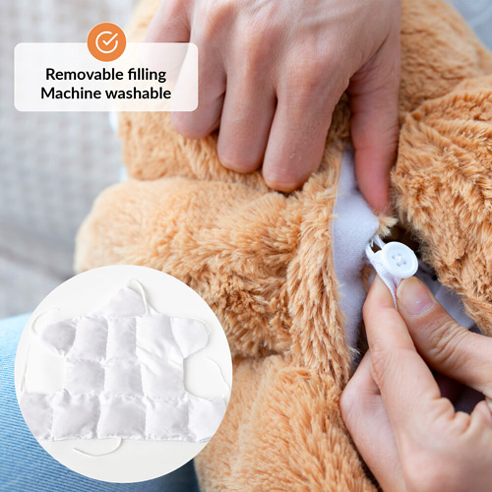 El peluche es fácil de llevar a cualquier parte con la bolsa de transporte incluida. Y lo que es mejor: el relleno del peluche se puede quitar y limpiar fácilmente después de horas de uso.