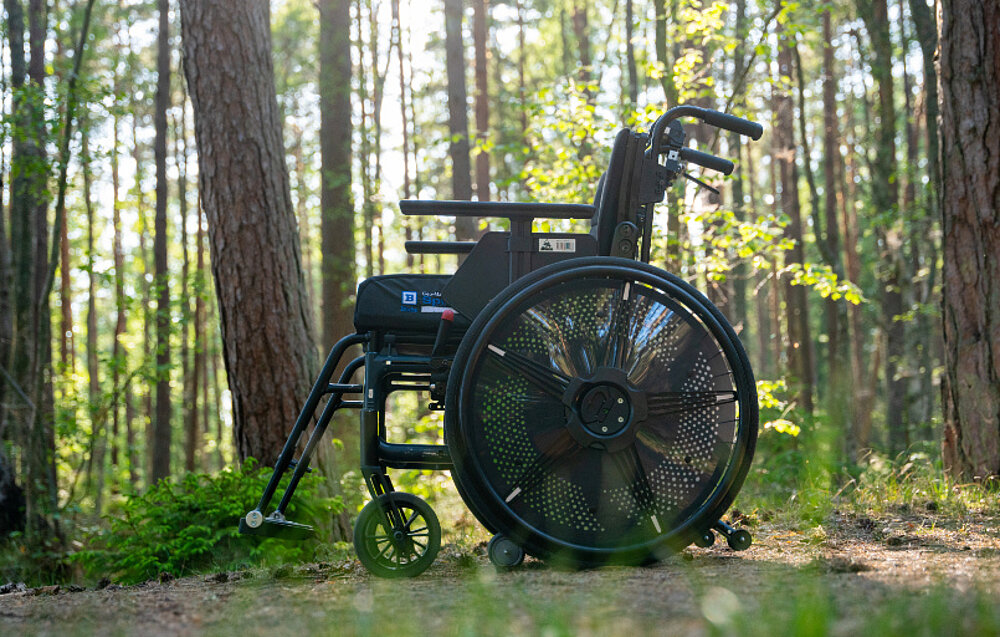 Easy Wheel es un sistema de accionamiento mecánico para sillas de ruedas manuales que genera hasta el 50% de la potencia necesaria para la locomoción. Permite a los usuarios de sillas de ruedas moverse de forma independiente a pesar del dolor y la fuerza limitada. Gracias al accionamiento por buje, el movimiento se convierte en potencia y la llanta de empuje recorre el doble de distancia que la rueda, reduciendo a la mitad el esfuerzo necesario.