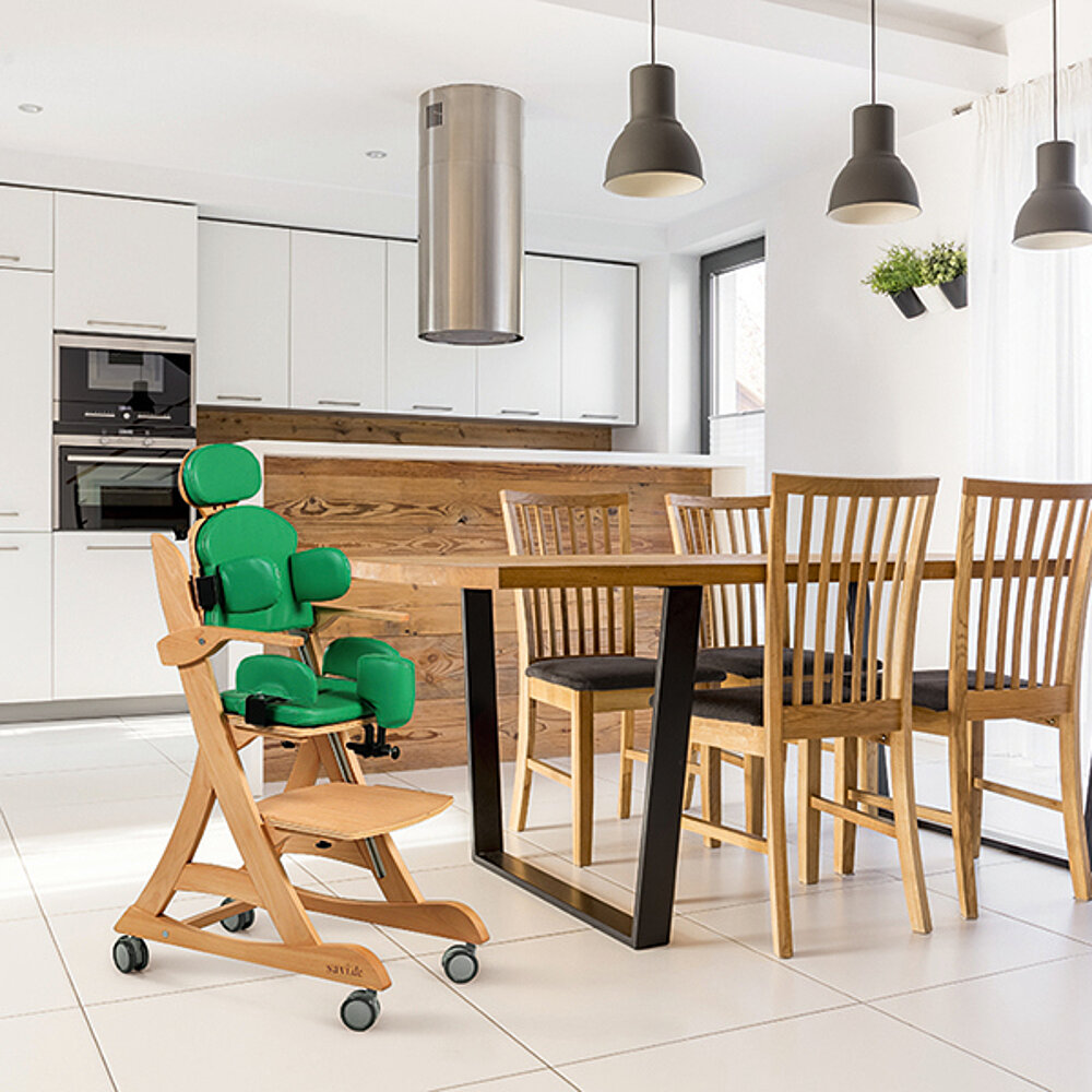 Robusto armazón de madera de haya lacada con perfiles de aluminio integrados. Respaldo regulable en altura y ángulo de inclinación. Reposabrazos regulables en altura. Placa de asiento y base con múltiples ajustes (altura, inclinación, profundidad). Tapizado de asiento y respaldo y ruedas de transporte incluidas.
