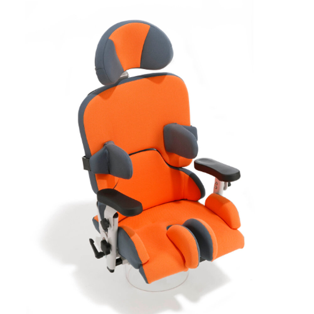El sistema de asiento de crecimiento ofrece profundidad y anchura de asiento ajustables para adaptarse al crecimiento del niño. El respaldo puede ajustarse en ángulo y altura y es extraíble opcionalmente. Para mayor comodidad, los reposabrazos pueden ajustarse en posición y el reposacabezas puede regularse en altura, profundidad y ángulo. Los soportes torácicos garantizan una posición sentada estable y erguida. El sistema de asiento está disponible en cuatro tamaños diferentes que crecen con el niño. Puede adaptarse a todas las bases disponibles en el mercado para ofrecer una mayor flexibilidad. Para una posición sentada perfecta, hay una guía para los muslos que favorece el movimiento hacia fuera de los muslos, y opcionalmente hay disponible una guía abductible para las piernas.