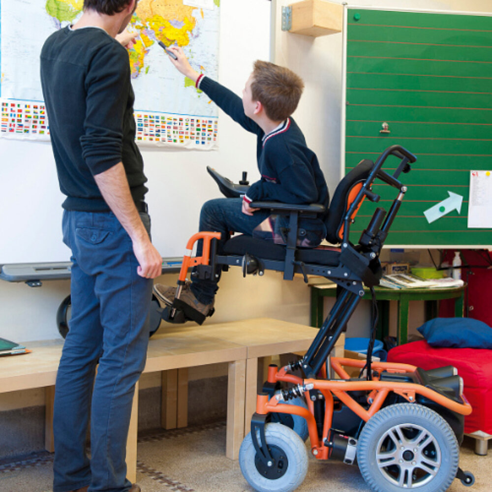 La silla de ruedas eléctrica para niños con función de asiento elevable, conocida como Springer, se ha diseñado especialmente para su uso en exteriores. Sus cuatro ruedas garantizan un contacto constante con el suelo, independientemente de las irregularidades del terreno. La Springer supera sin esfuerzo diferencias de altura de hasta 120 mm, lo que la hace especialmente adecuada para su uso fuera de la carretera.