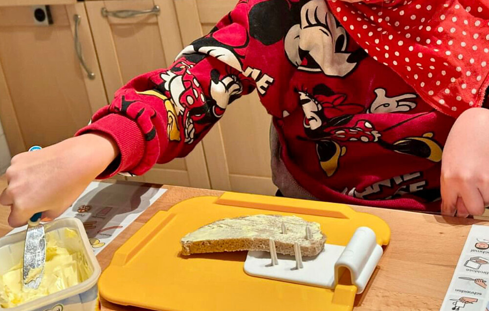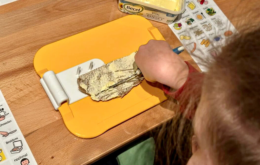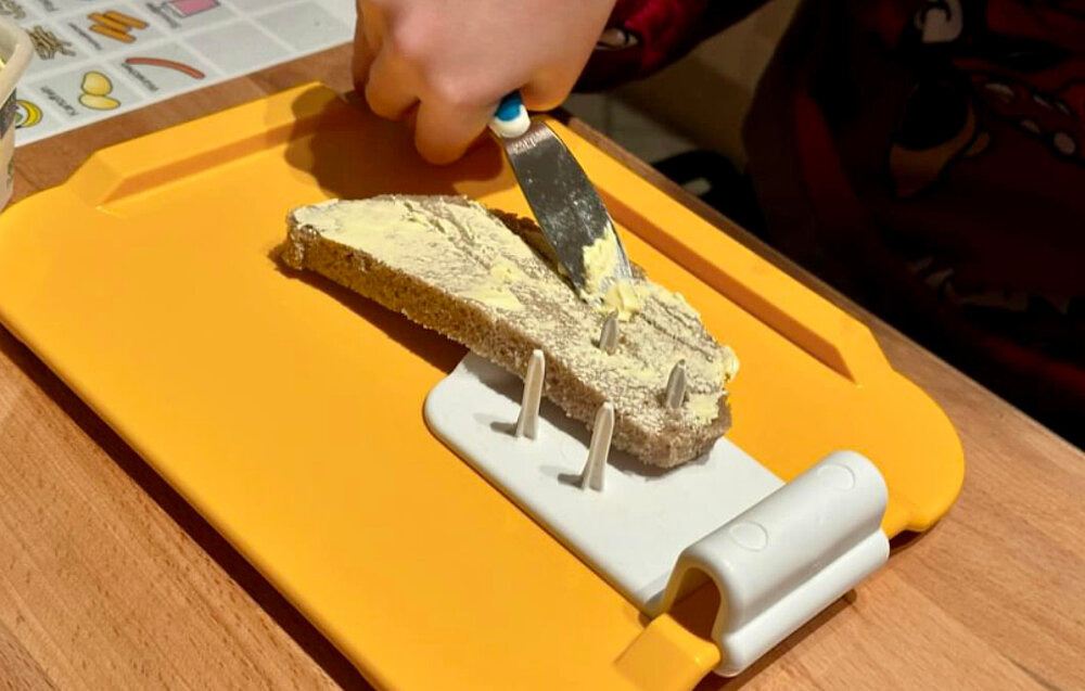Este producto permite untar el pan de forma independiente con una sola mano: el borde elevado en tres lados evita que la rebanada de pan resbale, mientras que el anillo antideslizante de la base garantiza un apoyo seguro. La ayuda para la preparación también puede utilizarse para sujetar panecillos, fruta y verdura, permitiendo la preparación con una sola mano.