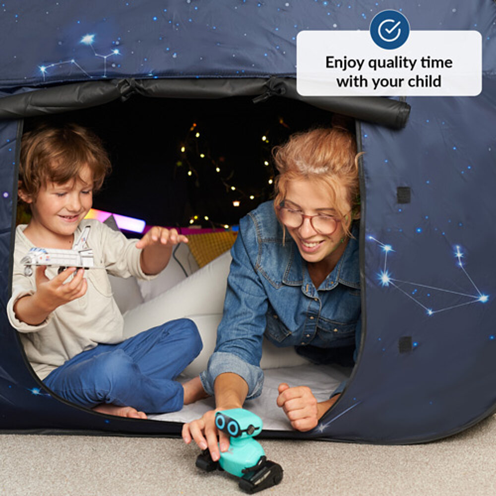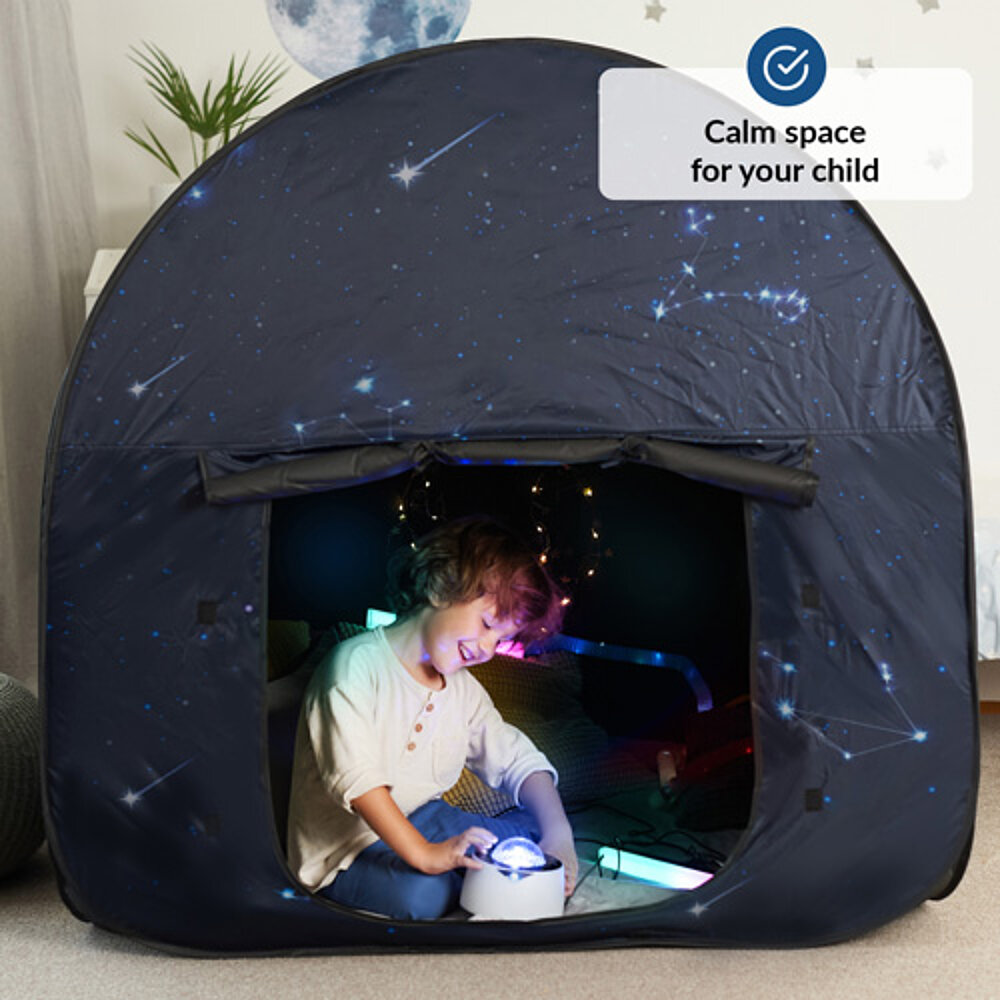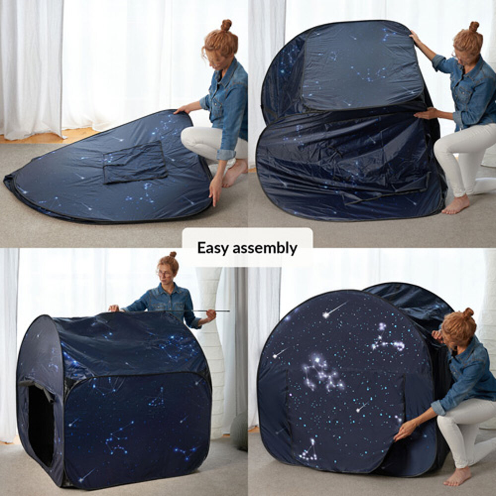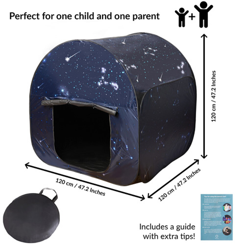 Rincón sensorial para niños: un espacio tranquilo dentro de un espacio, ideal para jugar y relajarse. La tienda proporciona un entorno seguro para niños con necesidades especiales como SPD, autismo o problemas de concentración. Con su efecto de oscurecimiento, también es adecuada para juegos con luz y crea un espacio separado para los sentidos. Rápida de montar y portátil, es perfecta para casa o el colegio cuando falta un retiro separado.