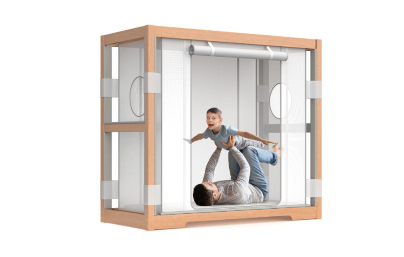 Nuestro modelo TOBI está hecho especialmente para niños muy activos y autoagresivos. Estos niños necesitan lugares seguros para protegerse a sí mismos y a su entorno. Nuestra TOBI de KayserBett ofrece precisamente a estos niños un lugar donde refugiarse. La cama consta de un sólido armazón de madera en el que se cuelga una red. Esta red extremadamente elástica permite a los niños esforzarse físicamente al máximo y luego volver a descansar. La red absorbe la fuerza de los golpes y las patadas, de modo que todo el impacto queda amortiguado. Se puede ver rápidamente cómo los niños vuelven a relajarse. En comparación con las camas en las que los niños tienen contacto directo con la madera o el cristal acrílico, la red del interior de la cama evita el contacto con materiales ruidosos. Se monta el marco de haya maciza y se fija la red. La red de malla fina es casi transparente desde el interior hacia el exterior. La cama tiene siempre una altura interior constante de 180 cm. Esto significa que los niños tienen espacio suficiente para mantenerse erguidos en la cama. La red, que también es ignífuga, no sólo hace que la cama sea un lugar acogedor para dormir, sino que también le da un ambiente muy hogareño, como de tienda de campaña. Esto significa que nuestra TOBI puede convertirse rápidamente en un centro de aventuras.