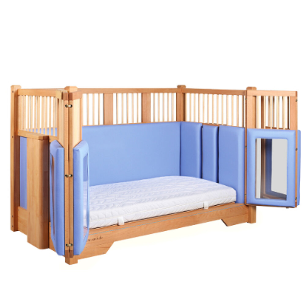 La cama de cuidado infantil Tom combina funcionalidad, seguridad y un diseño acogedor en un concepto cuidadosamente elaborado. Con una puerta corredera plegable de cuatro paneles, barandillas laterales seguras y ajuste de altura flexible, ofrece un apoyo óptimo tanto en el cuidado diario como en contextos terapéuticos.