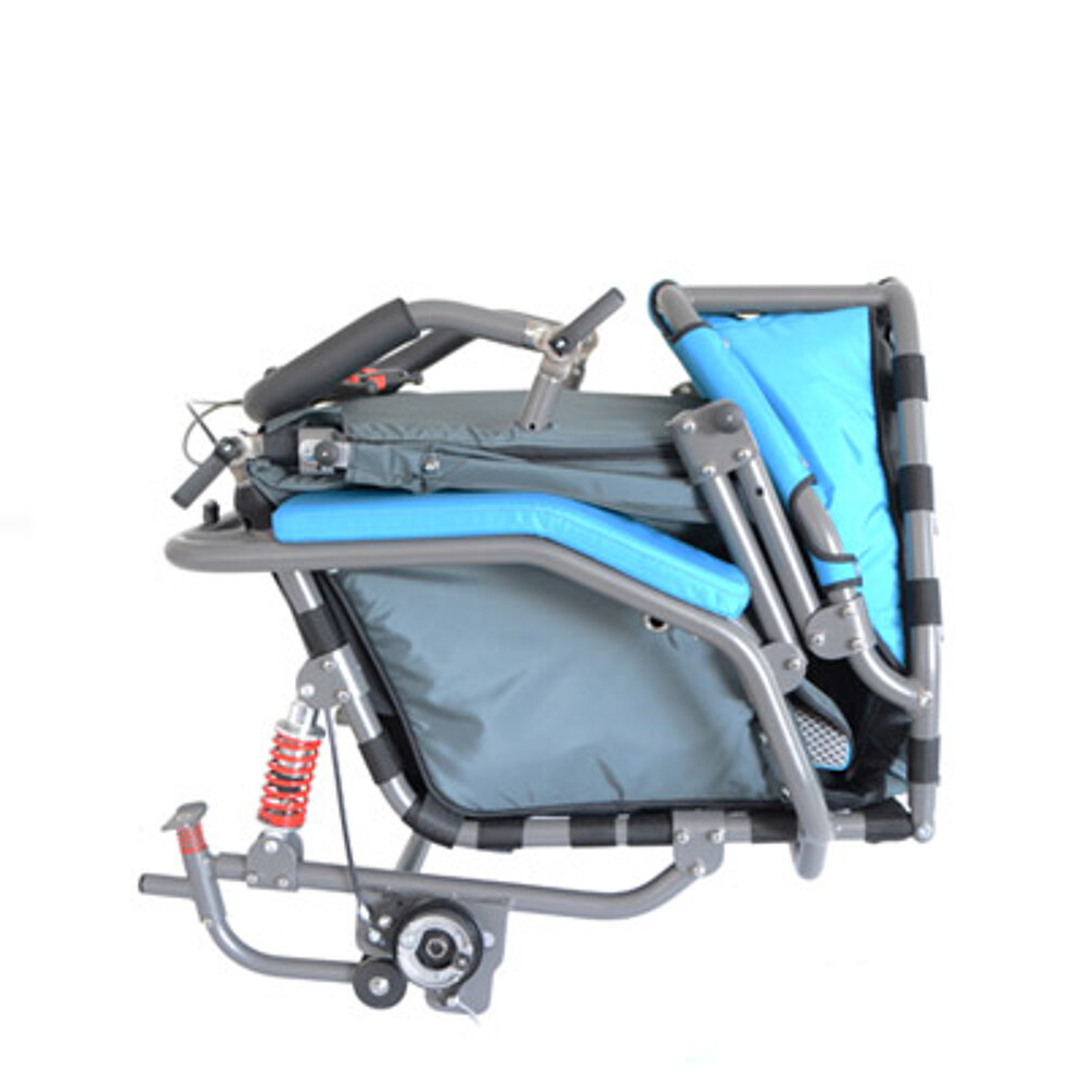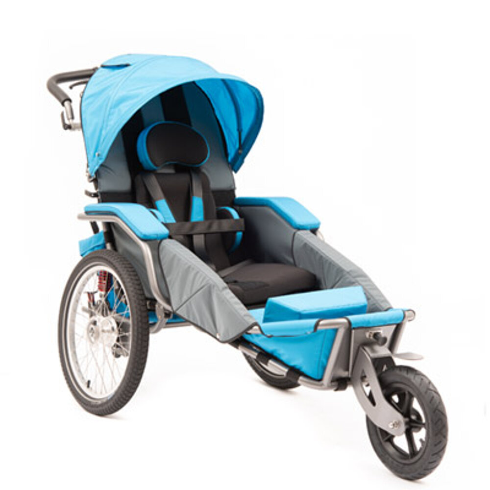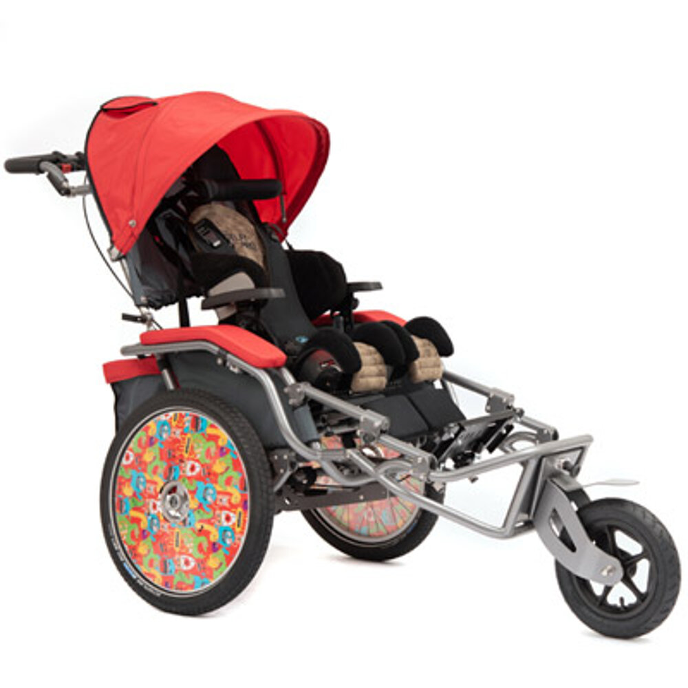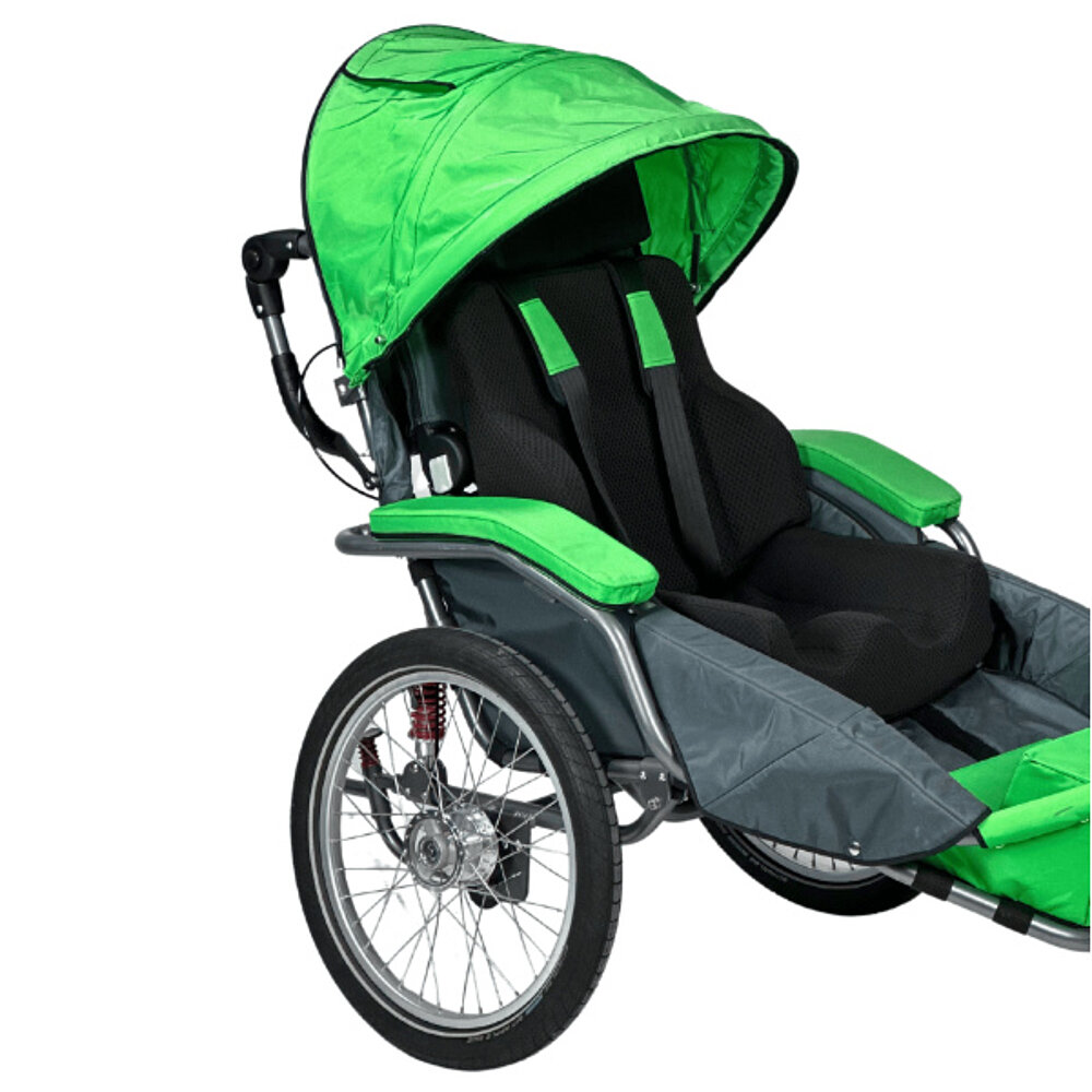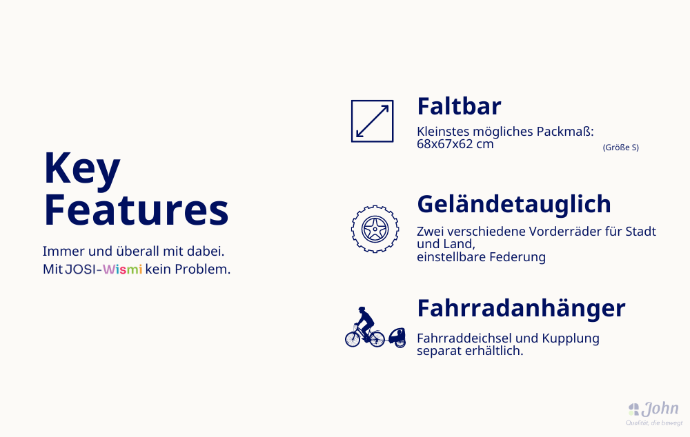 El carrito de rehabilitación multifuncional tiene una rueda trasera de 20" con frenos de tambor para aparcar y frenos de servicio. En la parte delantera hay una rueda fija todo terreno, una pequeña rueda giratoria con o sin función de bloqueo, la rueda Pro de 12,5" ajustable y bloqueable para uso deportivo o una barra de tracción para bicicletas. El JOSI-Wismi también se puede utilizar como remolque de bicicleta, se puede plegar rápida y fácilmente y es un fiel compañero en las subidas y bajadas. La posición del asiento puede ajustarse con flexibilidad y está disponible en tres tallas diferentes (S, M y L, para estaturas de hasta 175 cm) y en tres modernos colores. También está disponible un accionamiento eléctrico, así como diversos accesorios especialmente diseñados para el JOSI-Wismi.